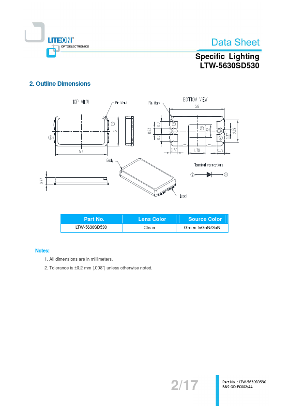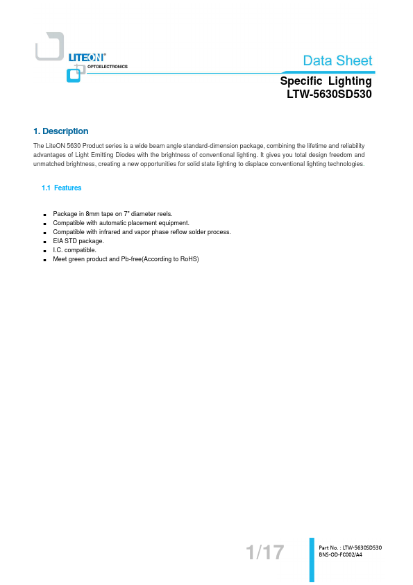 * Package in 8mm tape on 7" diameter reels. Compatible with automatic placement equipment. Compatible with infrared and vapor phase reflow solder process. EIA STD package. I. C. compatible. Meet green product and Pb-free(According to RoHS) 1/17 Part No. : LTW-5630SD530 BNS-OD-FC002/A4 2. Outline Dim📁 Related Datasheet