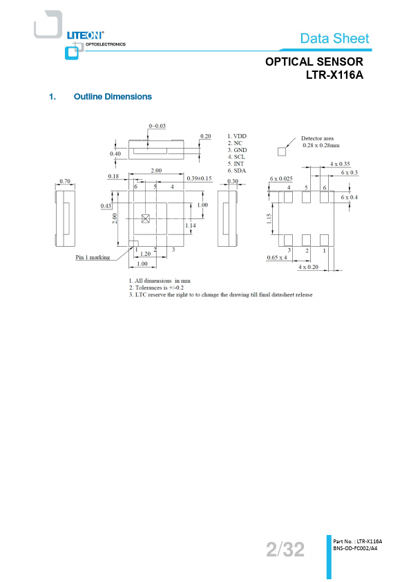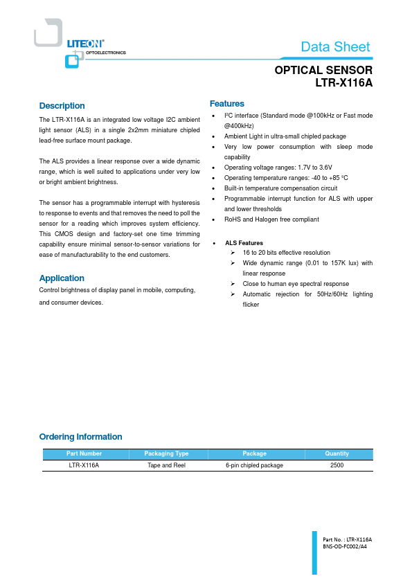 Optical Sensor Product Data Sheet LTR-X116A Spec No.:DS86-2018-0037 Effective Date: 12/21/2018 Revision: - LITE-ON DCC RELEASE BNS-OD-FC001/A4 LITE-O.LTR-X116A Features