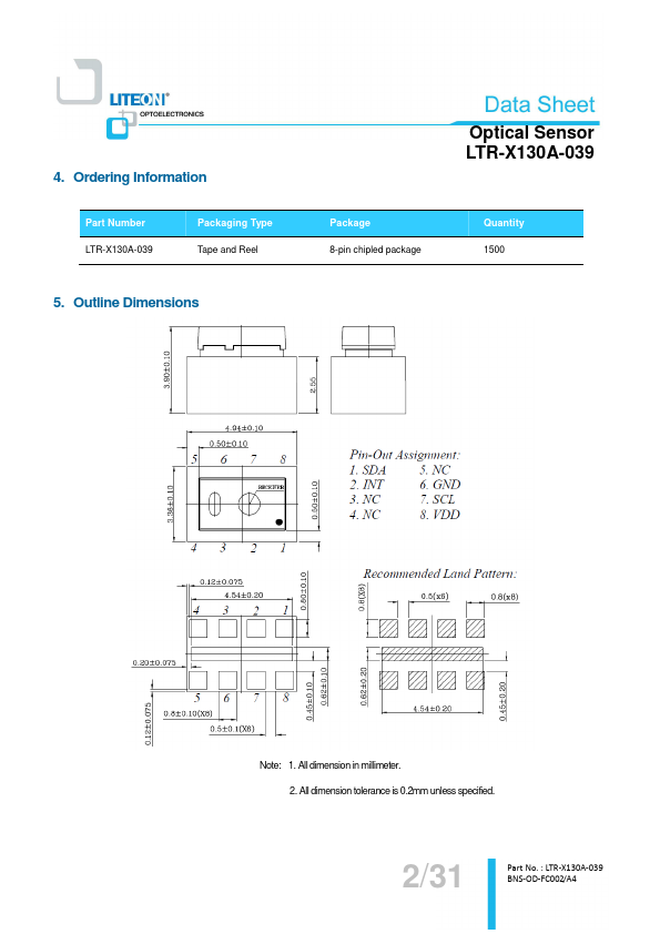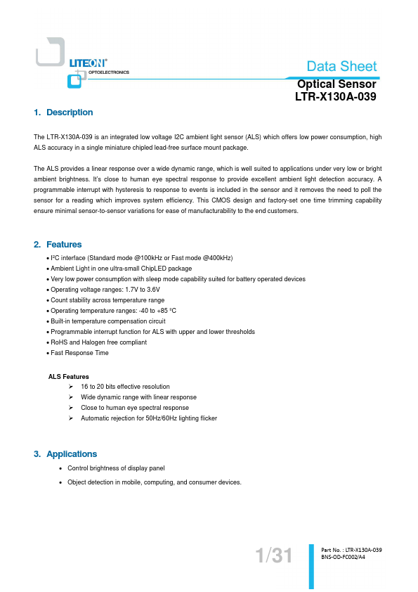 Optical Sensor Product Data Sheet LTR-X130A-039 Spec No.:DS86-2020-0023 Effective Date: 11/26/2020 Revision: - LITE-ON DCC RELEASE BNS-OD-FC001/A4 LI.LTR-X130A-039 Features