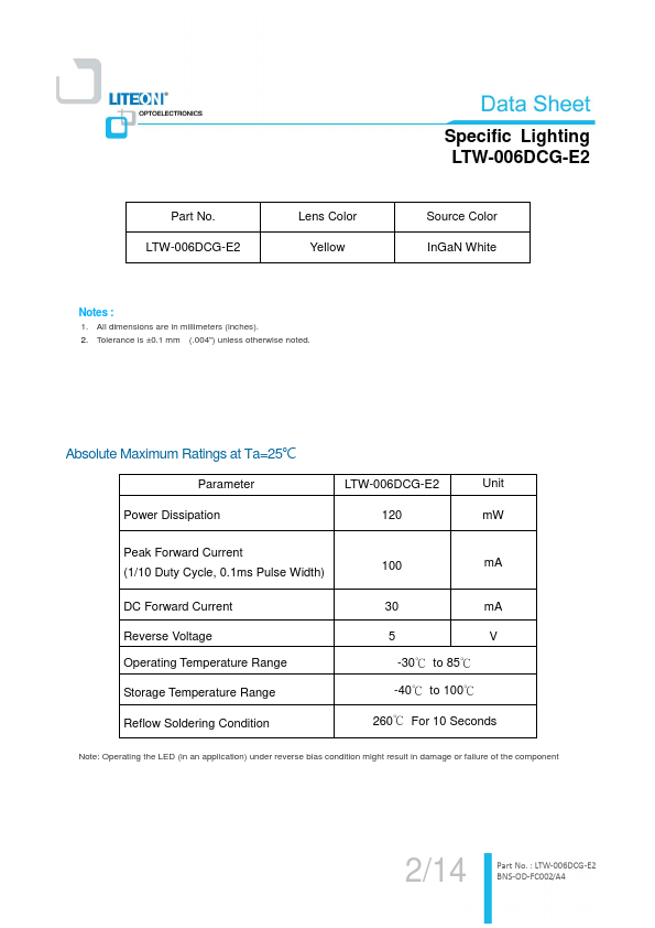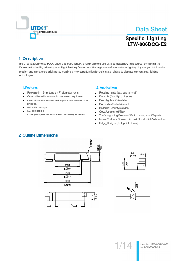 Specific Lighting Product Data Sheet LTW-006DCG-E2 Spec No.:DS22-2009-0147 Effective Date: 11/11/2017 Revision: G LITE-ON DCC RELEASE BNS-OD-FC001/A4.LTW-006DCG-E2 Applications