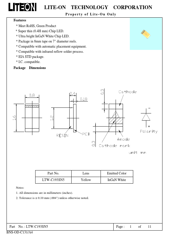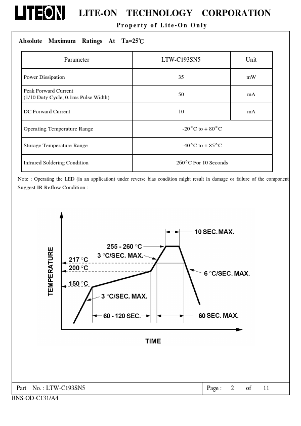 SMD LED Product Data Sheet LTW-C193SN5 Spec No.:DS22-2009-0004 Effective Date: 12/29/2020 Revision: F LITE-ON DCC RELEASE BNS-OD-FC001/A4 LITE-ON Tec.LTW-C193SN5 Features