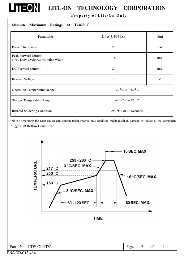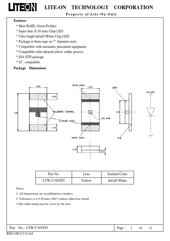 SMD LED Product Data Sheet LTW-C194TS5 Spec No.:DS22-2005-186 Effective Date: 04/21/2020 Revision: I LITE-ON DCC RELEASE BNS-OD-FC001/A4 LITE-ON Tech.LTW-C194TS5 Features
