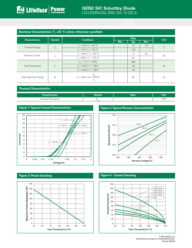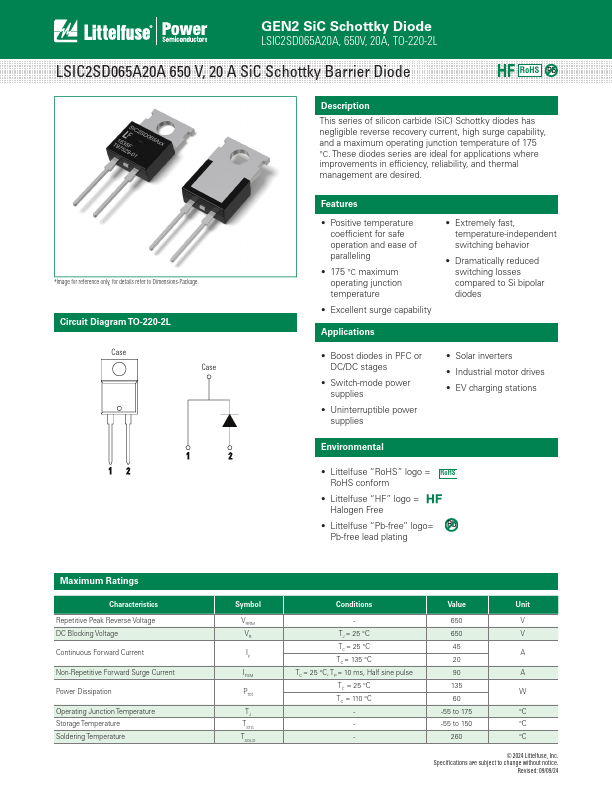 GEN2 SiC Schottky Diode LSIC2SD065A20A, 650V, 20A, TO-220-2L LSIC2SD065A20A 650 V, 20 A SiC Schottky Barrier Diode RoHS Pb *Image for reference .Features