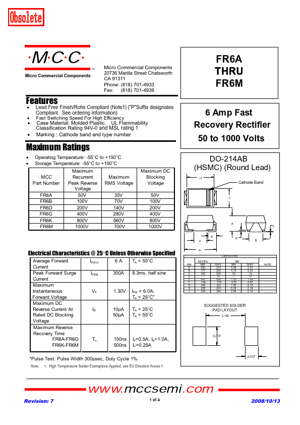 * Lead Free Finish/Rohs Compliant (Note1) ("P"Suffix designates Compliant. See ordering information)