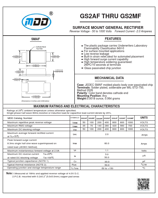 * Low reverse leakage Built-in strain relief,ideal for automated placement High forward surge current capability High temperature soldering guaranteed: 260 C/10 seconds at terminals Glass passivated chip junction 0.051(1.30) 0.039(1.0) 0.193(4.90) 0.173(4.40) Dimensions in inches and (millimeters) MGS2AF Distributors