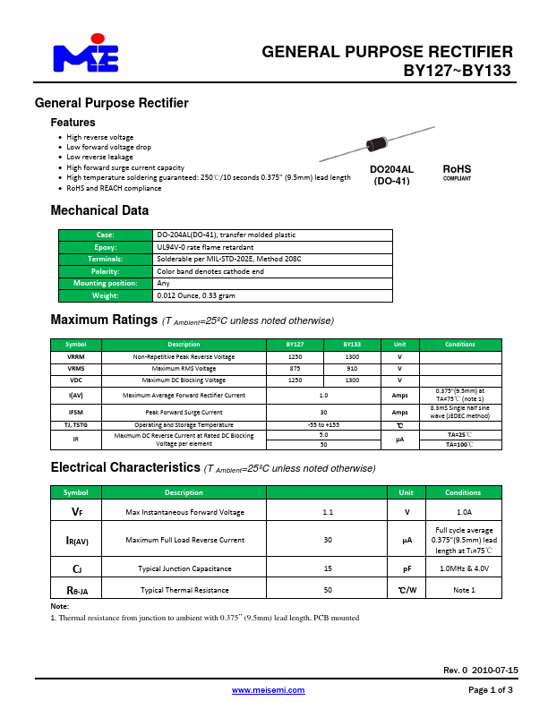 GENERAL PURPOSE RECTIFIER BY127~BY133 General Purpose Rectifier .Features