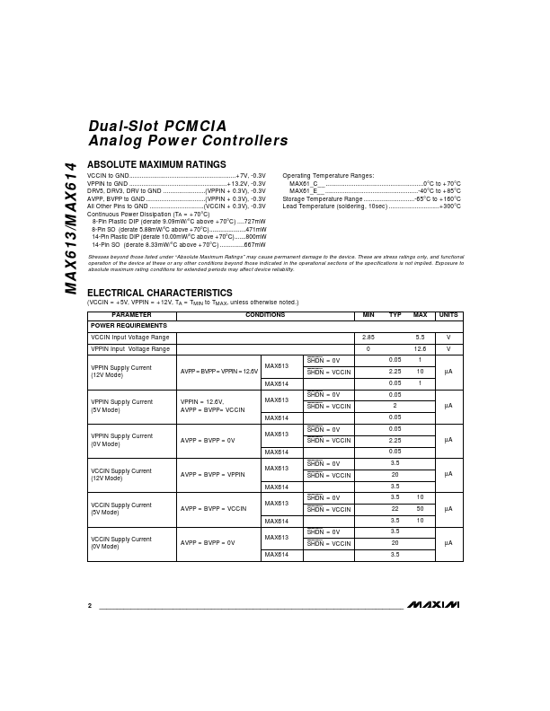 The MAX613/MAX614 contain switches for the VPP supply-voltage lines for Personal Computer Memory Card International Association (PCMCIA) Release 2.0 card slots.
