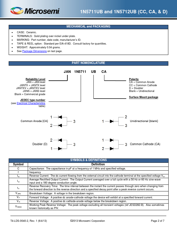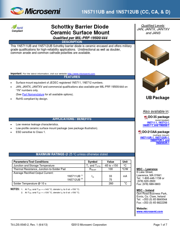 1N5711UB and 1N5712UB (CC, CA, & D) Schottky Barrier Diode Compliant Ceramic Surface Mount Qualified per MIL-PRF-19500/444 .