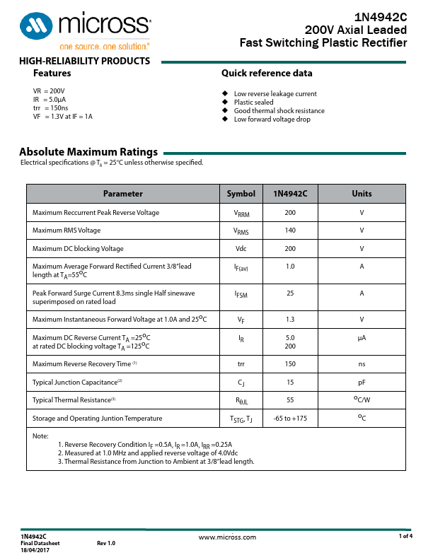 * VR = 200V IR = 5.0µA trr = 150ns VF = 1.3V at IF = 1A 1N4942C 200V Axial Leaded Fast Switching Plastic Rectifier Quick reference data Low reverse leakage current Plastic sealed Good thermal shock resistance Low forward voltage drop Absolute Maximum Ratings Electrical specifications @ TA =1N4942C Distributors