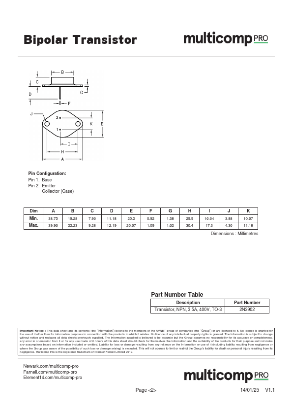 Datasheet Details Part number 2N3902 Manufacturer Multicomp File Size 144.49 KB Datasheet 2N3902-Multicomp.pdf Description Bipolar Transistor