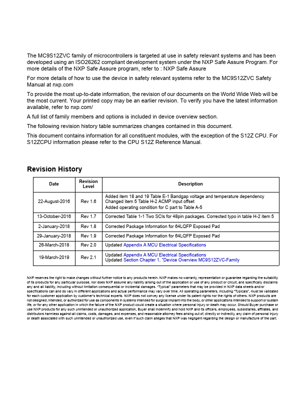 This datasheet PDF includes multiple part numbers: S912ZVC19F0MLF, S912ZVCA19F0MKH. Please refer to the document for exact specifications by model. |