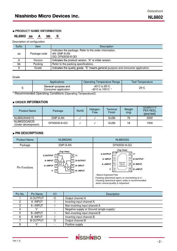 The NL8802 is a high quality sound dual audio operational amplifier that applies the high quality sound technology of "MUSES" to a more productive technology.