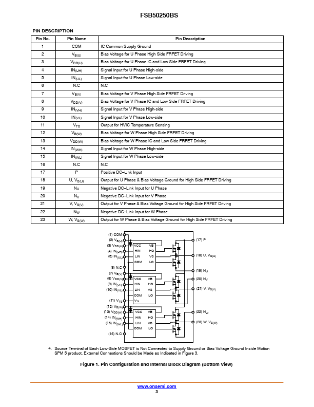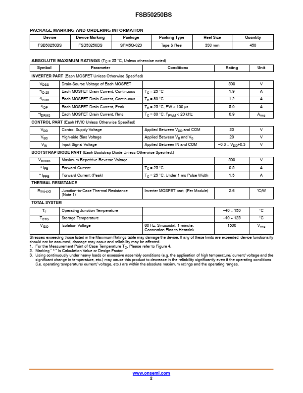 The FSB50250BS is an advanced Motion SPM 5 module providing a fully-featured, high-performance inverter output stage for AC Induction, BLDC and PMSM motors such as refrigerators, fans and pumps.These modules integrate optimized gate drive of the built-in MOSFETs (FRFET technology) to minimize EMI and losses, while also providing multiple on-module protection