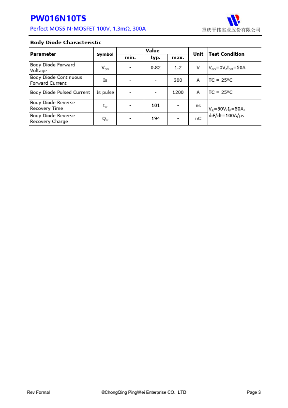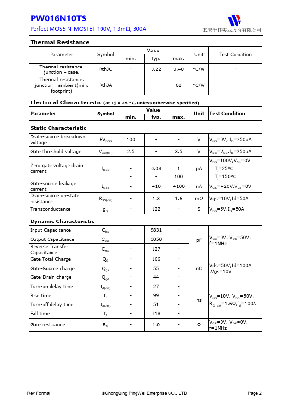 The PW016N10TS by PINGWEI is a 100V 300A N-MOSFET. Below is the official datasheet preview.