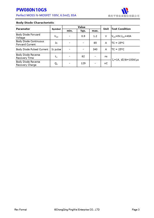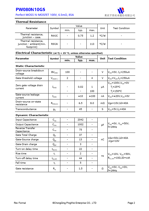 The PW080N10GS by PINGWEI is a 100V 85A Perfect MOS5 N-MOSFET. Below is the official datasheet preview.