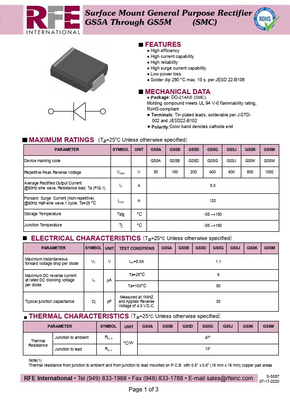 Surface Mount General Purpose Rectifier GS5A Through GS5M (SMC) .Features