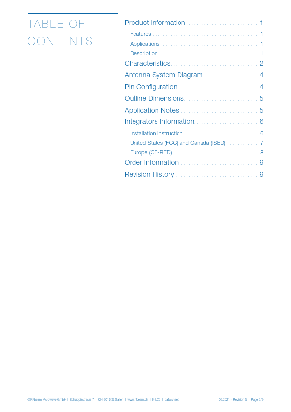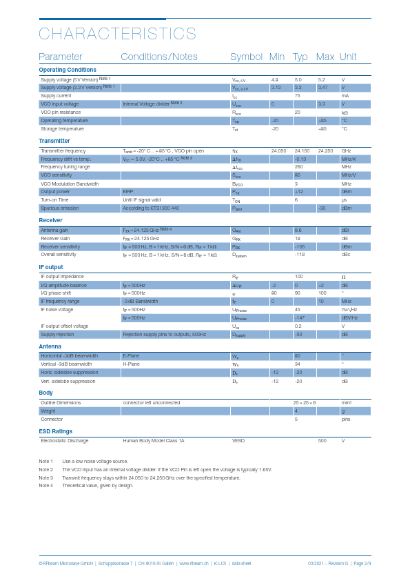 Block Diagram 24 GHz short range transceiver Beam aperture 80 °/ 34 ° Pin-compatible with K-LC2 3.3 V and 5 V Version available Highly linear VCO with 260 MHz tuning range High sensitive LNA receiver I / Q IF outputs Compact size: 25 mm × 25 mm × 6 mm Low frequency drift over temperature Security systems Directional object speed measurement systems Directional movement detecto