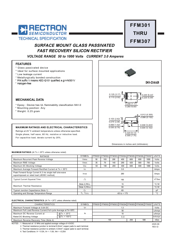 • FFM301G - 3.0A Surface Mount Fast Recovery Rectifiers (American First Semiconductor)