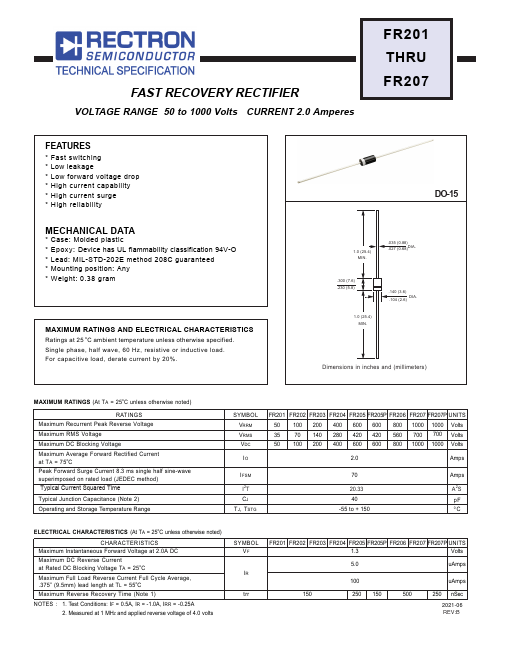 FAST RECOVERY RECTIFIER VOLTAGE RANGE 50 to 1000 Volts CURRENT 2.0 Amperes FR201 THRU FR207 .