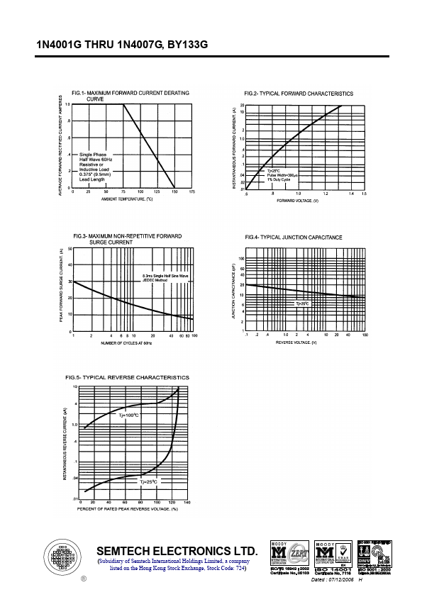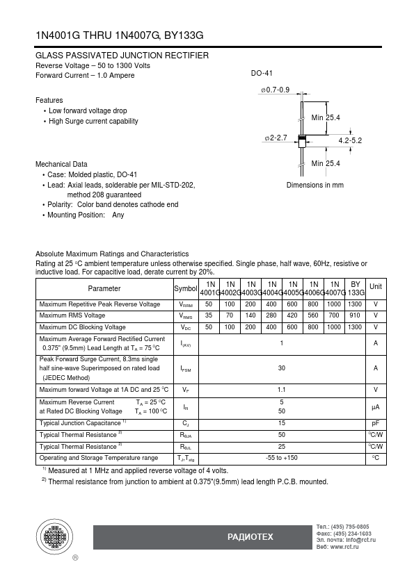 1N4001G THRU 1N4007G, BY133G GLASS PASSIVATED JUNCTION RECTIFIER Reverse Voltage * 50 to 1300 Volts Forward Current * 1.0 Ampere Featu.Features