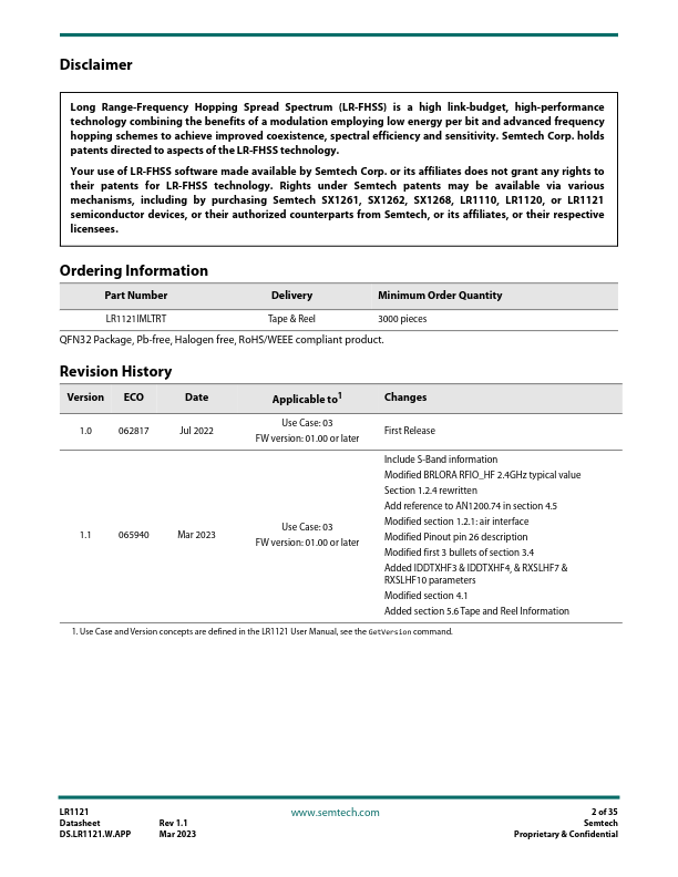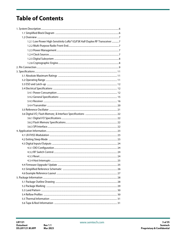 Modified first 3 bullets of section 3.4 Added IDDTXHF3 & IDDTXHF4, & RXSLHF7 & RXSLHF10 parameters Modified section 4.1 Added section 5.6 Tape and Reel Information 1. Use Case and Version concepts are defined in the LR1121 User Manual, see the GetVersion command.LR1121 Datasheet DS.LR1121.W.APP Rev 1.1 Mar 2023 www.semtech.com 2 of 35 Semtech Proprietary & Confidential Table of Contents 1. System Description 6 1.1 Simplified Block Diagram 6 1.2 Overview 7 1.2.1 Low-Power High-Sensitivity