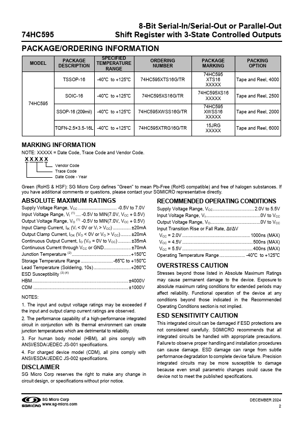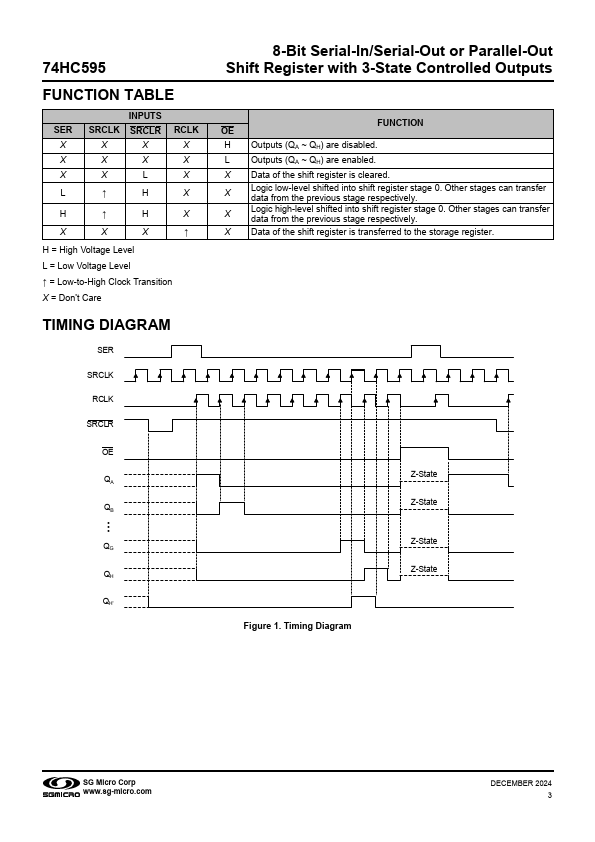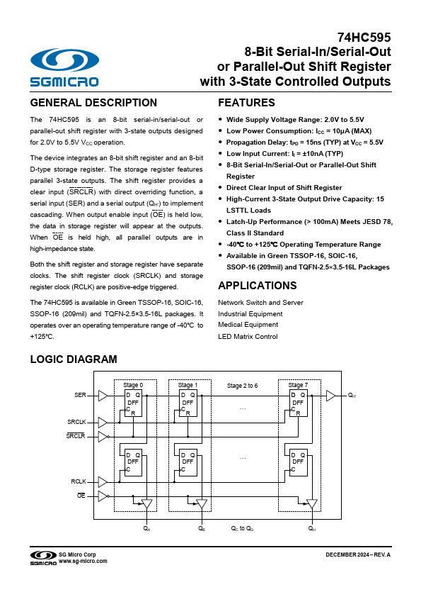 * Network Switch and Server Industrial Equipment Medical Equipment LED Matrix Control LOGIC DIAGRAM Stage 0 Stage 1 Stage 2 to 6 Stage 7 SER DQ DQ DFF DFF CR CR … DQ QH' DFF CR SRCLK SRCLR DQ DFF DQ DFF … C C RCLK OE DQ DFF C QA SG Micro Corp www. sg-micro. com QB QC to QG74HC595 Distributors