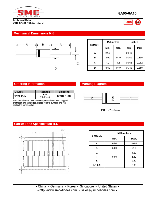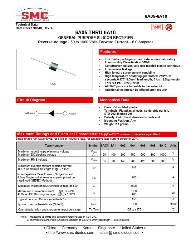 6A05-6A10 Technical Data Data Sheet N0549, Rev.C 6A05 THRU 6A10 GENERAL PURPOSE SILICON RECTIFIER Reverse Voltage - 50 to 1000 Volts Forward Current .Features