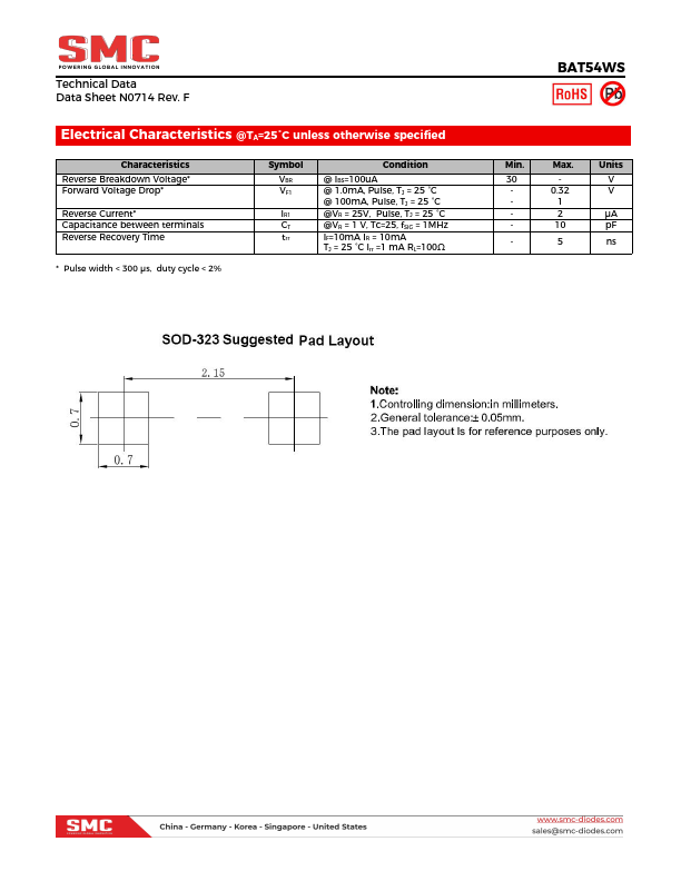 Technical Data Data Sheet N0714 Rev.F BAT54WS SURFACE MOUNT SCHOTTKY BARRIER DIODE BAT54WS SOD-323 .