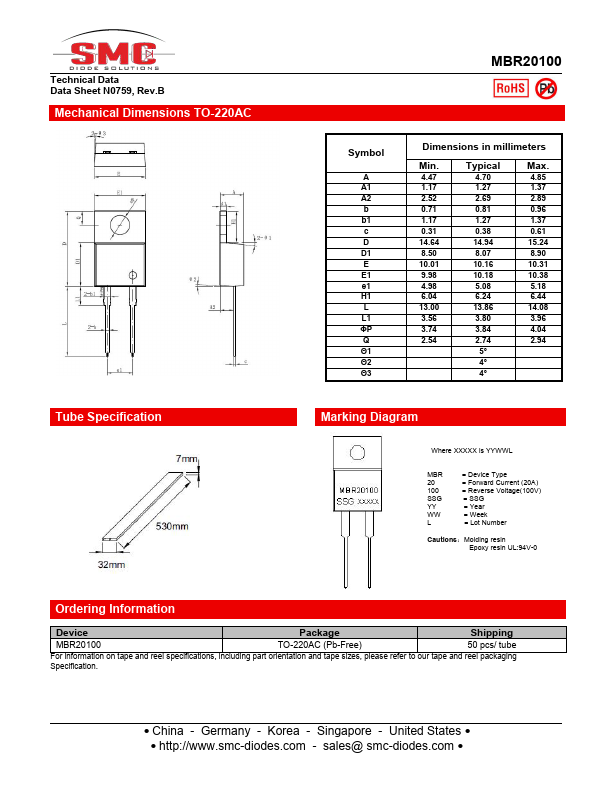 Technical Data Data Sheet N0759, Rev.B MBR20100 SCHOTTKY RECTIFIER MBR20100 TO-220AC .