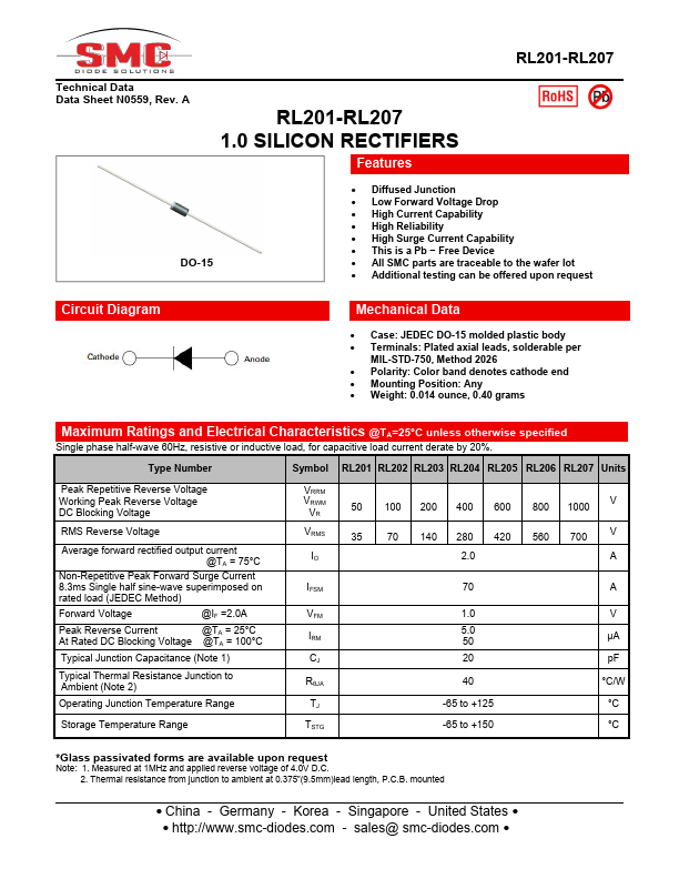 RL201-RL207 Technical Data Data Sheet N0559, Rev.A RL201-RL207 1.0 SILICON RECTIFIERS .