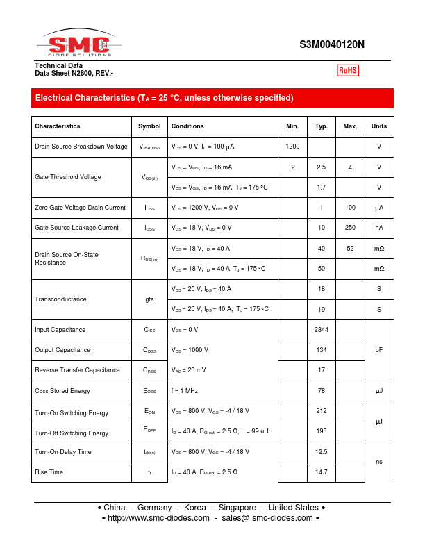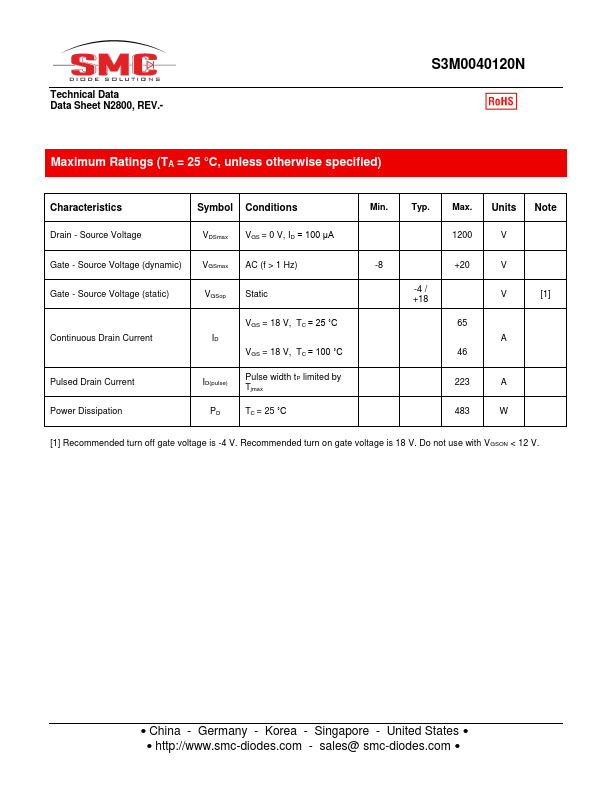 S3M0040120N Technical Data Data Sheet N2800, REV.- S3M0040120N 1200V SIC POWER MOSFET VDS = 1200 V IDS@ 25℃ = 65 A RDS(on) = 40 mΩ .S3M0040120N Features