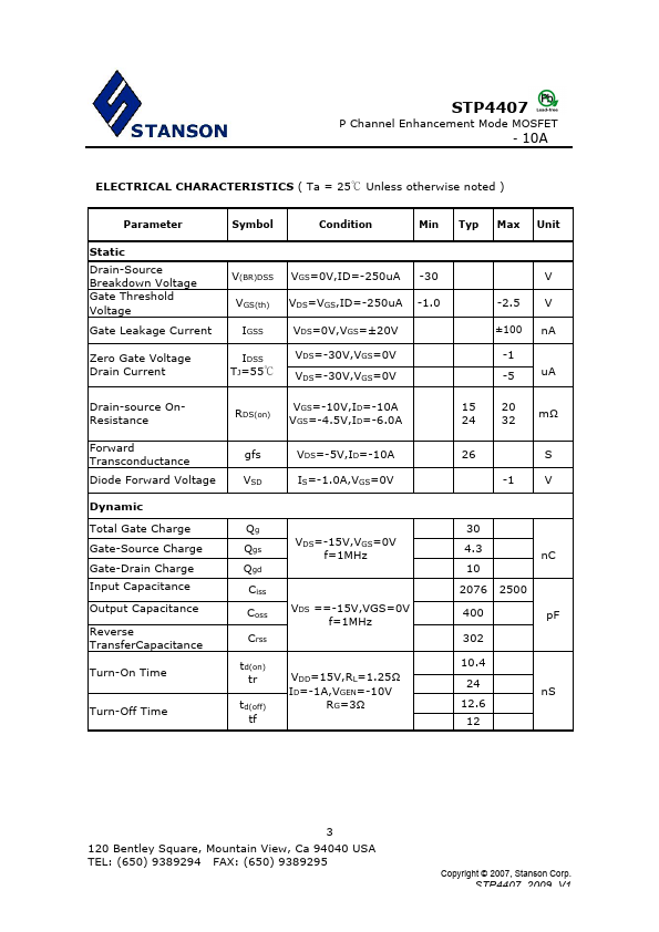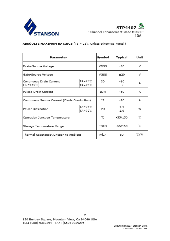 The STP4407 by STANSON is a P-Channel Enhancement Mode MOSFET. Below is the official datasheet preview.