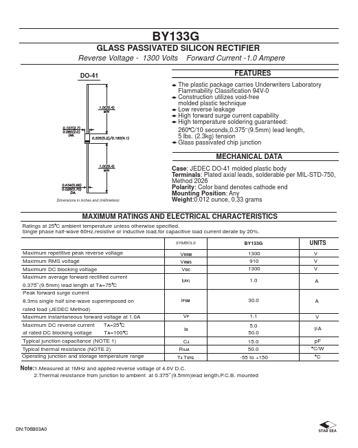 BY133G GLASS PASSIVATED SILICON RECTIFIER Reverse Voltage - 1300 Volts Forward Current -1.0 Ampere DO-41 .Features