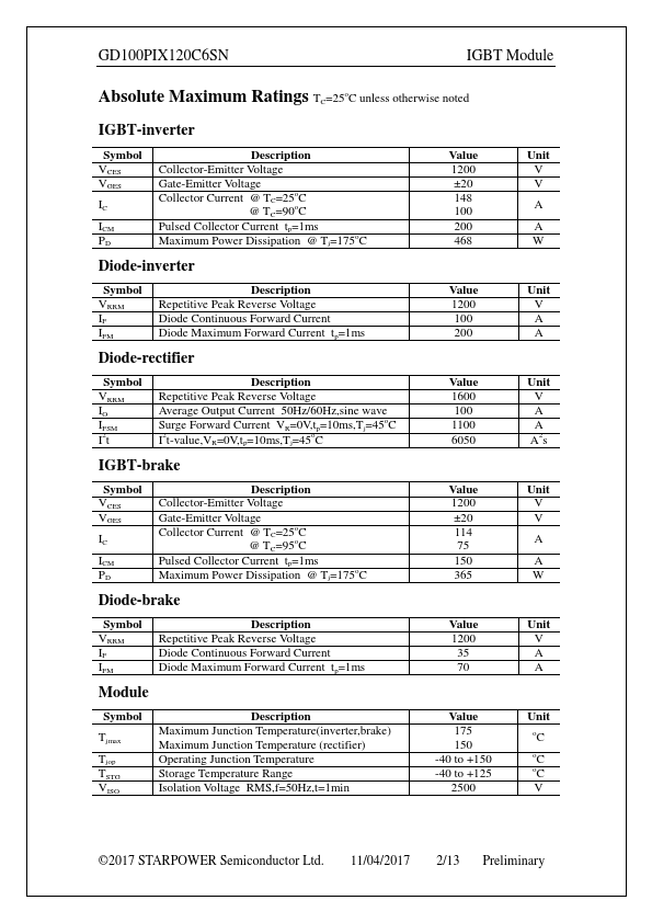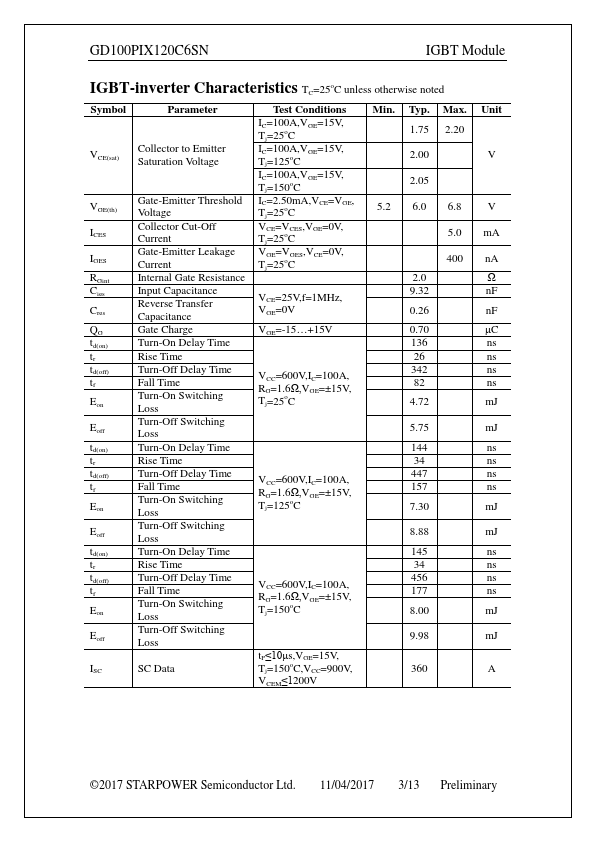 The GD100PIX120C6SN by STARPOWER is a IGBT. Below is the official datasheet preview.