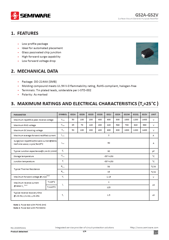 - This datasheet PDF includes multiple part numbers: GS2J, GS2A.