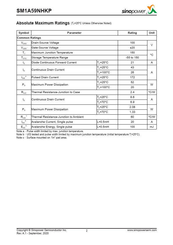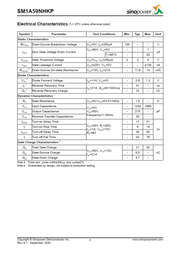 The SM1A59NHKP by Sinopower is a N-Channel Enhancement Mode MOSFET. Below is the official datasheet preview.