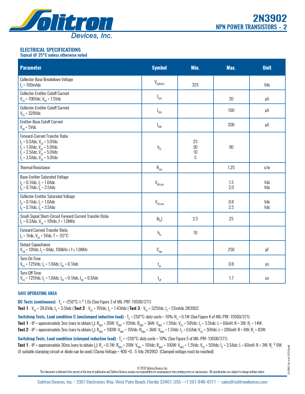 * JAN/JANTX/JANTXV STANDARD PRODUCTS QUALIFIED PER MIL-PRF-19500/371 LOW ON RESISTANCE FAST SWITCHING HIGH OFF ISOLATION HIGH POWER TRANSISTOR SECOND SOURCE FOR MICROSEMI DESIGNED FOR USE IN HIGH VOLTAGE INVERTERS, CONVERTERS, SWITCHING REGULATORS AND LINE OPERATED AMPLIFIERS Part Number 2N3902 Pack📁 Related Datasheet