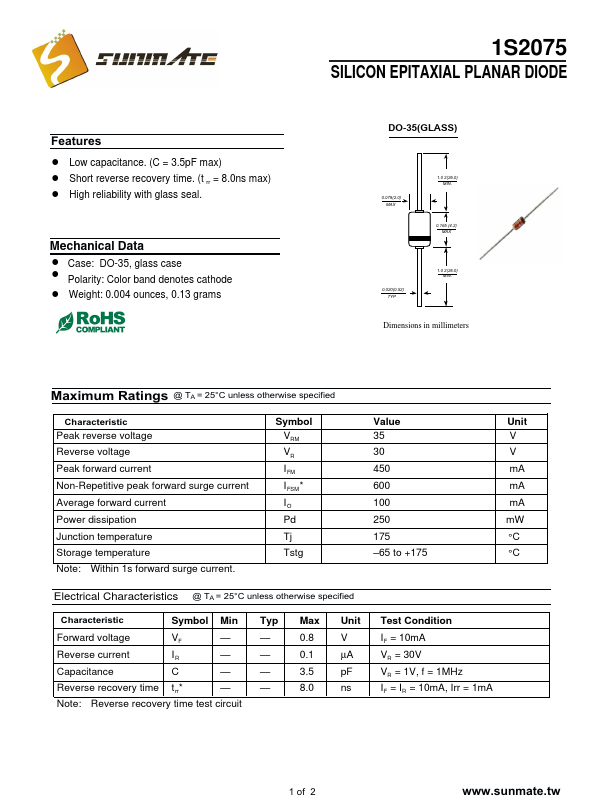 * ! Low capacitance. (C = 3.5pF max) ! Short reverse recovery time. (t rr = 8.0ns max) ! High reliability with glass seal. Mechanical Data ! Case: DO-35, glass case ! Polarity: Color band denotes cathode ! Weight: 0.004 ounces, 0.13 grams 1S2075 SILICON EPITAXIAL PLANAR DIODE DO-35(GLASS) 0.079(2.01S2075 Distributors