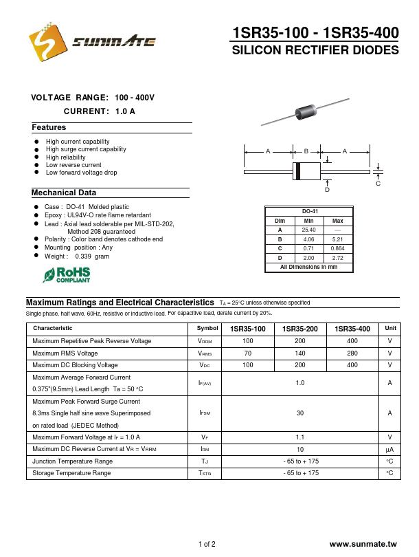 1SR35-100 - 1SR35-400 SILICON RECTIFIER DIODES VOLTAGE RANGE: 100 - 400V CURRENT: 1.0 A .Features