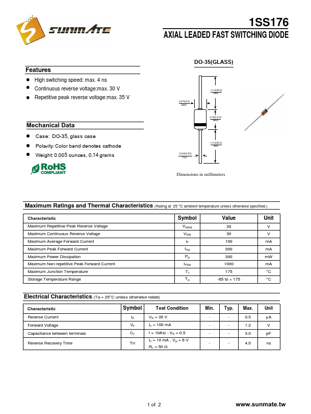 * ! High switching speed: max. 4 ns ! Continuous reverse voltage:max. 30 V ! Repetitive peak reverse voltage:max. 35 V Mechanical Data ! Case: DO-35, glass case ! Polarity: Color band denotes cathode ! Weight: 0.005 ounces, 0.14 grams 1SS176 AXIAL LEADED FAST SWITCHING DIODE DO-35(GLASS) 0.079(2.0)1SS176 Distributors