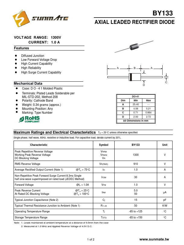 * ! Diffused Junction ! Low Forward Voltage Drop ! High Current Capability ! High Reliability ! High Surge Current Capability Mechanical Data ! Case: D O - 4 1 Molded Plastic ! Terminals: Plated Leads Solderable per MIL-STD-202, Method 208 ! Polarity: Cathode Band ! Weight: 0.34 grams (approx. ) ! MounBY133 Distributors
