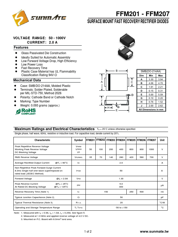 FFM201 - FFM207 SURFACE MOUNT FAST RECOVERY RECTIFIER DIODES VOLTAGE RANGE: 50 - 1000V CURRENT: 2.0 A .Features