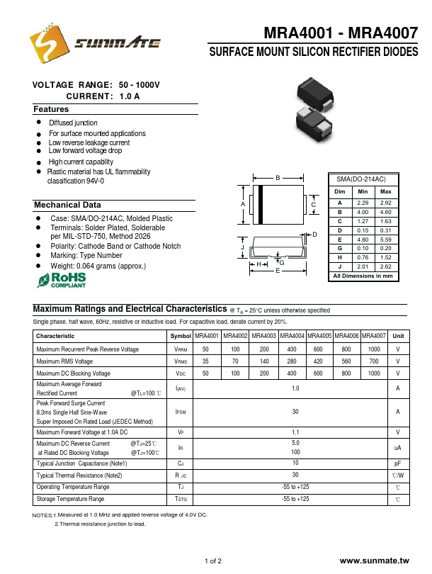 - This datasheet PDF includes multiple part numbers: MRA4006, MRA4001.