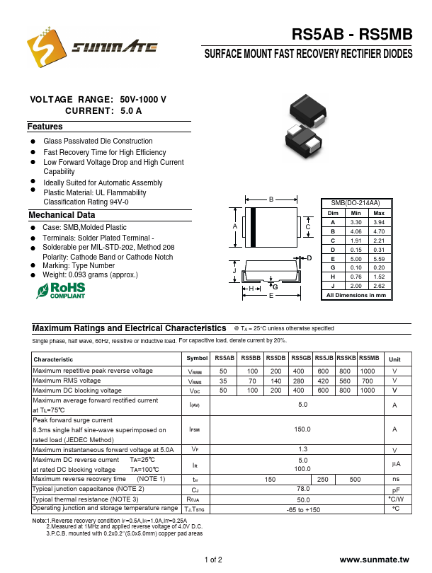 RS5AB - RS5MB SURFACE MOUNT FAST RECOVERY RECTIFIER DIODES VOLTAGE RANGE: 50V-1000 V CURRENT: 5.0 A .Features