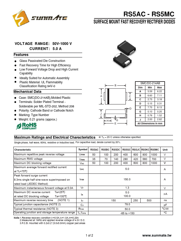RS5AC - RS5MC SURFACE MOUNT FAST RECOVERY RECTIFIER DIODES VOLTAGE RANGE: 50V-1000 V CURRENT: 5.0 A .Features