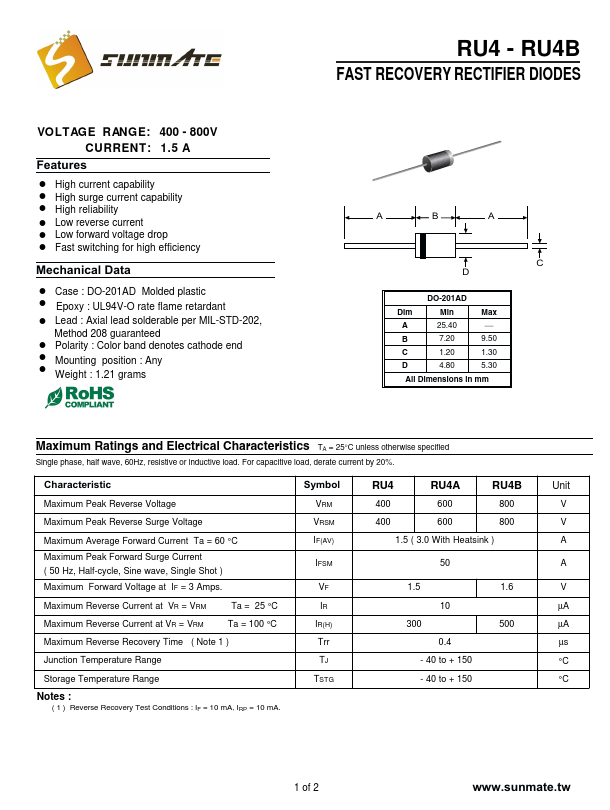 * ! High current capability ! High surge current capability ! High reliability ! Low reverse current ! Low forward voltage drop ! Fast switching for high efficiency Mechanical Data ! Case : DO-201AD Molded plastic ! Epoxy : UL94V-O rate flame retardant ! Lead : Axial lead solderable per MIL-STD-202, MRU4A Distributors