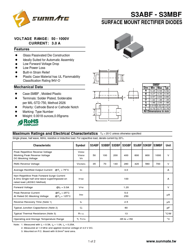 S3ABF - S3MBF SURFACE MOUNT RECTIFIER DIODES VOLTAGE RANGE: 50 - 1000V CURRENT: 3.0 A .Features