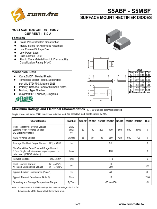 S5ABF - S5MBF SURFACE MOUNT RECTIFIER DIODES VOLTAGE RANGE: 50 - 1000V CURRENT: 5.0 A .Features