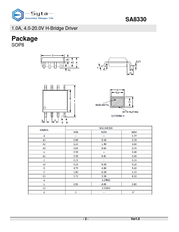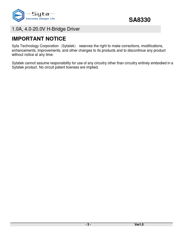 The SA8330 is one channel H-Bridge driver IC, it provides integrated motor-driver solution for toys, robotics, consumer products and other low voltage or battery-powered motion control applications.