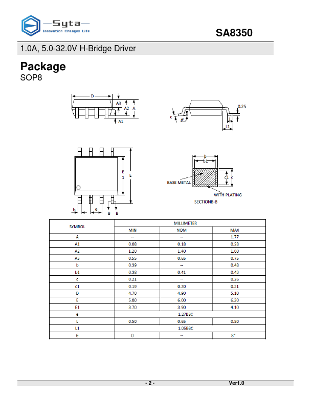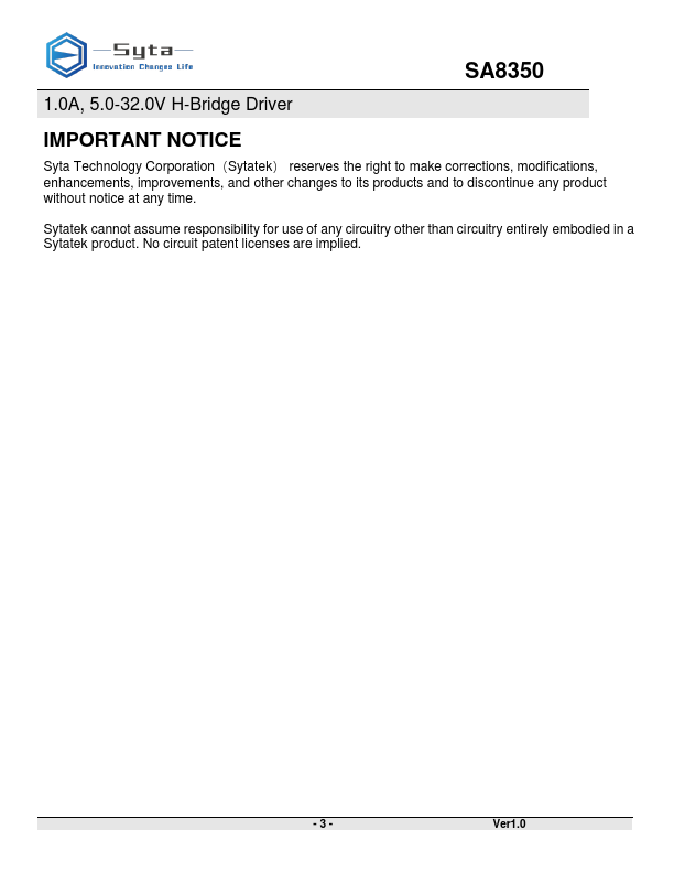 The SA8350 is one channel H-Bridge driver IC, it provides integrated motor-driver solution for toys, robotics, consumer products and other low voltage or battery-powered motion control applications.